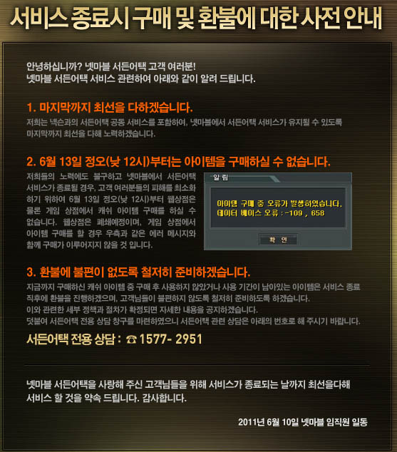 ... 또, 그간 '서든어택'이용자가 구매한 캐시 아이템중 기간이 남았거나 사용하지 않은 아이템에 대해서는 전액 환불 하겠다고 밝혔다. 한편, 오는 7월 10일, 넷마블의 '서든어택' 독점 서비스의 계약은 만료 된다. [정우순 기자 soyul@chosun