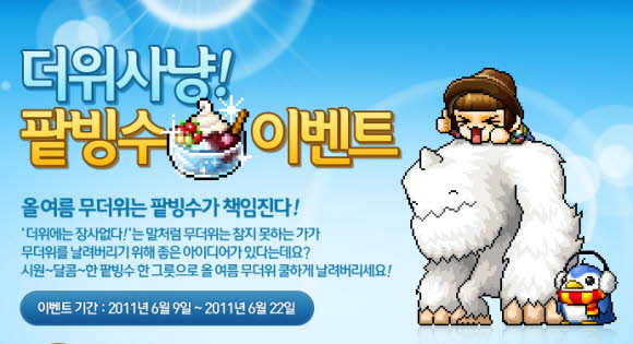 ... 먼저 9일부터 22일까지 2주간 더위사냥! 팥빙수 이벤트가 진행된다. 유저는 해당 기간 동안 몬스터를 사냥해 획득한 팥빙수 재료로 빙수를 만들면 출석 체크를 할 수 있고, 종료 후 출석 일수에 따라 팥빙수, 파워엘릭서, 비밀의 레시피, 얼음결정 페이스페인팅 등의 보상 아이