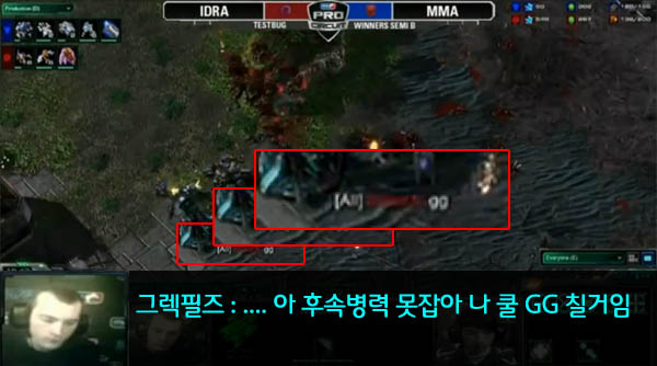 ... 최근 열린 메이저 리그 게이밍(MLG) 콜럼버스 승자조 준결승전에서 그렉필즈는 문성원을 상대로 또 다시 쿨GG를 선언해 MLG 해설진과 현장에 있던 관객, 그리고 인터넷으로 경기를 시청하던 전세계 팬들을 당황하게 했다. 문성원은 자신의 황금멀티 지역 사령부를 강제어택으로 파
