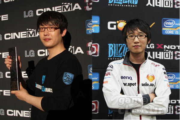 ... ▲ GSL 코드S 우승자 임재덕(좌)과 코드A 우승자 최지성(우)이 32강에서 맞붙게 됐다. 28일 목동 곰TV 스튜디오에서 진행된 'LG시네마3D 슈퍼토너먼트' 64강 6일차 경기에서 최지성(스타테일)과 임재덕(IM), 최성훈(프라임), 크리스(LQ)가 32강 진출에