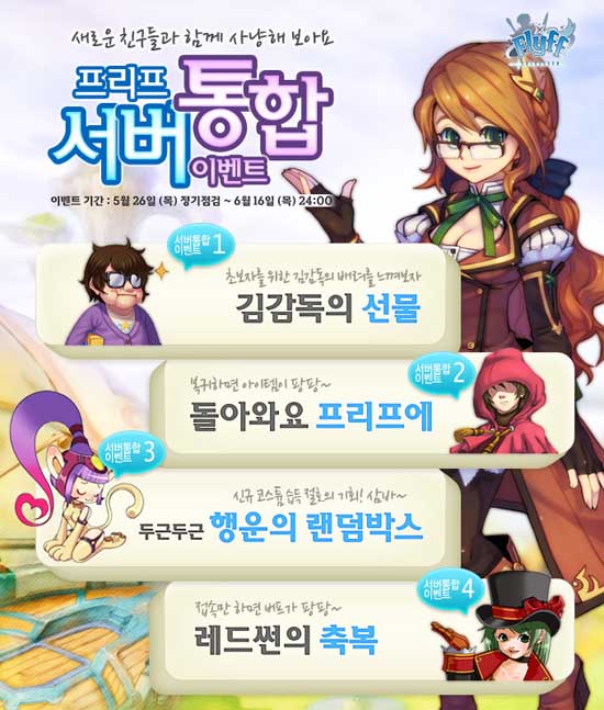 ... 서버통합과 함께 이벤트 기간 동안 접속하는 1~60레벨의 게이머들에게 김감독의 쿠폰을 지급해, 1차 전직을 완료하고 쿠폰과 함께 김감독 NPC를 찾아가면 45레벨 방어구를 보상한다. 또, 15레벨 이상의 몬스터 사냥 시 행운의 랜덤 박스를 획득할 수 있으며, 접속만 해도 공