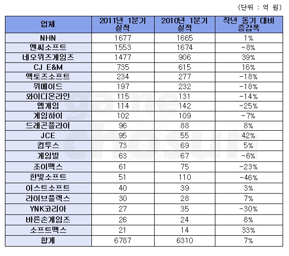 ... 올해 1분기 주요 상장 게임사들의 실적을 살펴보면 NHN, NC소프트, 네오위즈게임즈, CJ E&M 등 상위 4개사는 대부분 성장곡선을 그렸지만, 대다수 중소업체들은 마이너스 성장을 기록했던 예년보다 매출이 감소하면서 하향곡선을 유지했다. 상위 4개사의 1분기