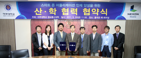 ...넥슨모바일(대표 이승한)은 20일 아주대학교 정보통신대학과 게임산업 우수인재 육성 및 기술 교류를 주요 내용으로 하는 산학협력 양해각서를 체결했다고 밝혔다. 이번 협약을 통해 넥슨모바일과 아주대학교 정보통신대학(미디어학부, 정보컴퓨터공학부)은 스마트폰용 게임 개발에 관한 맞춤식
