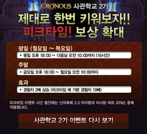 ...게임온스튜디오(대표 김종창)는 MMORPG '크로노스'의 사관학교 2기 서버를 대상으로 피크타임 이벤트를 실시한다. 본서버 대비 5배 빠른 캐릭터 육성과 70배의 아이템 드롭률, 115레벨을 달성할 경우 본 서버로의 캐릭터 이전이라는 파격적인 조건을 제시한 사관학교 2기 이벤트