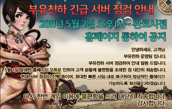 ... 하지만 '부유천하'는 전혀 다른 분야에서 유명세를 타 지금도 많은 이들이 기억하는 전설의 게임이 됐다. 유감이지만 안좋은 쪽 얘기다. '부유천하'는 2011년 5월 2일 오후 1시 경 갑작스러운 접속 오류로 긴급 서버 점검을 진행했고, 202