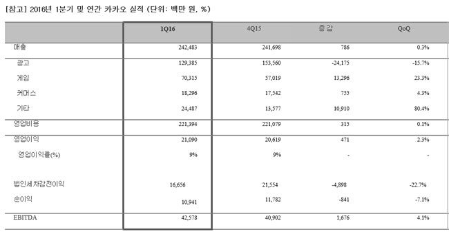 ...5% 늘었고 당기순이익은 109억원으로 64. 5% 감소했다. 카카오의 1분기 매출은 게임 부문에서 성장세를 보였다