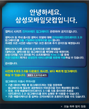 ... 지난 16일, 삼성전자는 자사의 삼성모바일닷컴을 통해 자사의 스마트폰 모델인 갤럭시 모델의 OS업그레이드 세부일정을 밝혔다. 갤럭시S 를 포함해 국내 출시된 갤럭시 모델에 대한 버전업 개념의 이번 업그레이드는 자사의 재택 업그레이드 프로그램 KIES2. 0을 통해 누구나 손