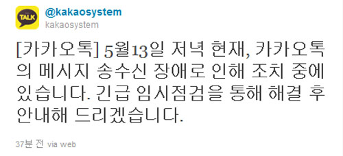 ...국내 스마트폰 이용자들이 애용하는 채팅 어플리케이션 '카카오톡'이 13일 오후 7시경 메세지 송수신 장애로 긴급 점검에 들어갔다. 최초 공개이후 꾸준히 이용자가 증가해온 이 어플리케이션은 최근 스마트폰 대중화 시기에 맞물려 폭발적으로 이용자가 증가했고, 최근 국내에서 약 1