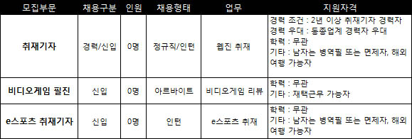 ...com [입사지원서 다운로드] ※ 비디오게임 지원시리뷰 3건 이상 첨부 ※ 접수된 서류는 반환하지 않습니다. ※ 지원 이메일 제목에 반드시 지원 분야 및 이름을 적어주세요 [취재기자/홍길동] ◈ 연 락 처 : 디지틀조선게임 (Tel. 728-6350) ◈ 게임조선에 합류