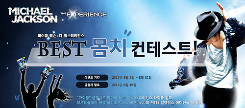 ... 우선 몸치 컨테스트는 게임을 플레이하는 모습을 동영상 또는 사진으로 촬영해 블로그에 포스팅한 뒤 이벤트 페이지에 응모하면 된다. 응모자 중 추첨을 통해 MJTE 컬렉터스 에디션이 포함된 Xbxo360 키넥트 패키지, 한정 마이크와 'Michael' 앨범 등을 증정한다. 다음
