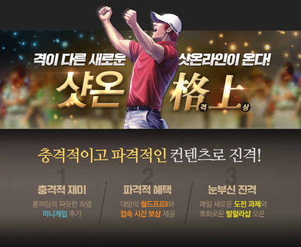 ...퍼팅의 정확도를 겨루는 '미니게임'도 추가된다. '미니게임'은 총 10단계로, 매 단계마다 주어지는 세 번의 퍼팅 기회 중 홀인에 성공하면 다음 단계에 도전할 수 있다. 싱글 플레이 방식으로 초보자도 손쉽게 즐길 수 있으며, 단계별로 획득한 '깃발'을 모아 게임 아이템들을 얻을