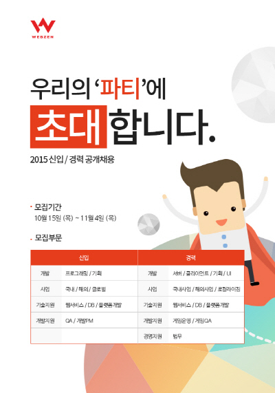 ...신입사원 모집 분야는 프로그래밍, 기획, 국내사업, 해외사업, 글로벌사업, 웹서비스, DB, 플랫폼개발, QA, 개발PM 등 총 10개 부문이다. 경력직은 국내사업, 해외사업, 로컬라이징, 서버, 클라이언트, 기획, UI, 웹서비스, DB, 플랫폼개발, 게임운영, 게임QA, 법무