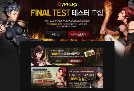 ... 당첨자는 16일부터 23일까지 8일간 진행되는 파이널 테스트에 참여하게 되며 공개시범(오픈베타) 테스트 이후에도 게임 내 닉네임을 유지할 수 있는 특전이 제공된다. 특히 이번 파이널 테스트에는 친구를 등록해 함께 게임을 즐길 수 있는 클랜 시스템과 캐릭터를 더욱 개성 있게 꾸밈