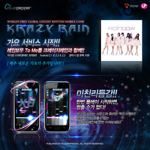... 첫 번째로 추가 된 대중가요는 레인보우의 신곡 “To Me”이며, 향후 1주일에 2~3곡의 대중가요를 꾸준히 추가 업데이트 하겠다는 계획이다. 또 블루페퍼는 '크레이지레인' 게임 게시판과 서포터즈 운영을 통해 유저들의 요청 곡에 대한 의견을 적극 수렴하여 추가 음원 업데이트에