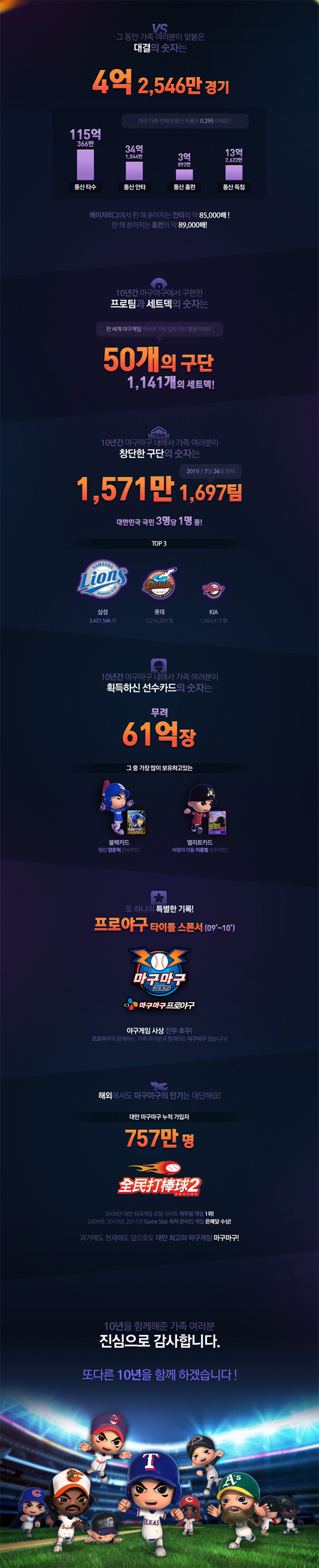 ... 넷마블이 공개한 이번 인포그래픽에 따르면 지금까지 ‘마구마구’에서 창단된 팀 수는 약 1572만 팀이다. 이중 삼성 라이온즈가 242만 팀으로 1위를 차지했고 롯데 자이언츠와 기아 타이거즈가 그 뒤를 이었다. 이용자들이 지난 10년 동안 획득한 카드 수는 61억장으로 전