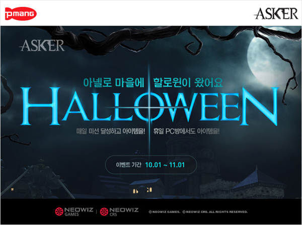 ... 뿐만 아니라 매 주 1주일간 미션을 3회, 5회 달성 시 할로윈 보너스로 추가 아이템을 획득 가능하다. 또, 휴일에 PC방에서의 '애스커' 이용 시간이 1시간 30분, 3시간 누적되면 PC방 아이템을 구매할 수 있는 포인트가 추가로 증정된다. 이 밖에도 10월 3일 개천절을 맞아