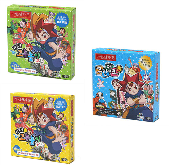 ...7급' '한자고누놀이 6급' '무한점프'의 3종 시리즈로, 별도의 한자공부 없이 보드게임 만으로도 한자능력검정시험 8급에서부터 6급까지 초등학생 필수한자는 물론 일상생활에서 자주 사용하는 핵심 고사성어를 보드게임을 통해 자연스럽게 배울 수 있도록 개발된 것이 특징이다. '마법천