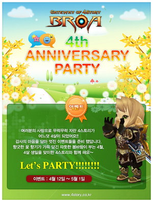 ... 게이머는 퀘스트를 통해 B, R, O, A 4글자를 모두 모은 후 캐시 아이템을 제공하는 선물 상자를 보상으로 받을 수 있다. 이 외에도 캐시 아이템 할인 이벤트, 주말 경험치 이벤트, 주말 성공 확률 상승 이벤트, 퀴즈 이벤트, 블랙 데이 이벤트가 진행된다. 신현호 개발실장