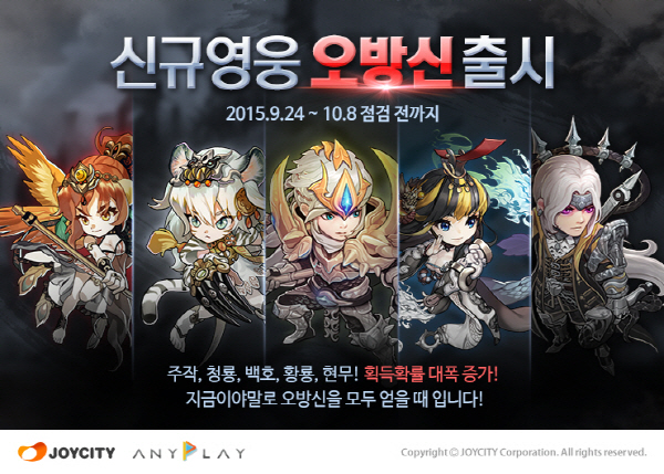 ...이와 함께 청룡과 주작, 백호, 현무, 황룡으로 구성된 오방신 콘셉트의 신규 캐릭터 5종이 출시 됐으며, 해당 캐릭터를 소환하는 유저를 대상으로 추첨을 통해 '루비(게임캐시)' 100개를 증정하는 이벤트도 열린다. 조이시티는 추석 연휴를 맞이해 '루비'와 '골드(게임머니)' '행동
