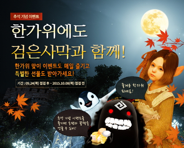 ...같은 기간 필드 사냥을 통해 '달빛조각'이 추가로 획득되며, 모은 조각의 개수에 따라 생명력, 정신력을 즉시 200 회복시켜주는 '꿀떡'과 여러 아이템이 포함된 '추석 선물 상자'로 교환할 수 있다. '추석 선물 상자'는 2000개의 펄이 들어있는 '펄 상자'와 크자카 무기, 보스
