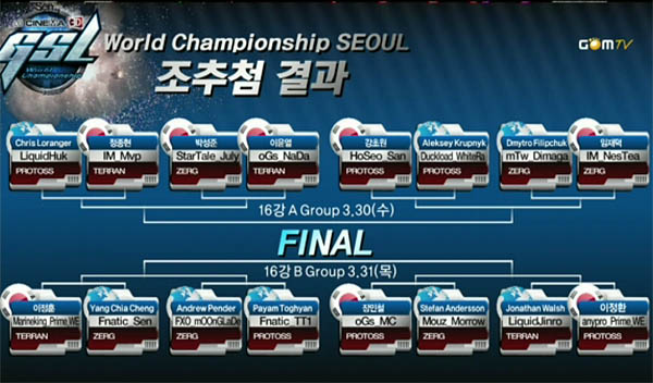 ...28일, 목동 곰TV 스튜디오에서 'LG시네마3D 월드 챔피언십 서울' 1일차 경기 후 16강 조추첨이 이뤄졌다. 16강전에서'투신' 박성준과 '천재' 이윤열간에 리벤지 매치와이벤트전에서 격돌한 '해병왕' 이정훈과 양치아청에 경기 등 흥미진진한 경기들이 성사되어 관심이 집중되고