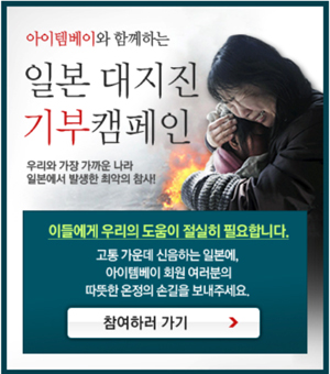 ... 이창석 아이템베이 대표는 "우리와 가장 가까운 나라인 일본에서 발생한 이번 대참사에 고객들과 함께 마음을 모아 작은 힘이나마 보태고자 이번 캠페인을 진행하게 됐다"며, "고객들의 정성을 소중히 모아 고통 받고 있는 일본의 피해자들에게 잘 전달될 수 있도록 하겠다"고 말했다. 회