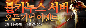 ... 또한, 신규서버 불카누스의 오픈을 기념해 이벤트 역시 진행된다. 친구 추천 이벤트, 금화 지원 이벤트, 보너스 금화 지급 이벤트, 최고 관직 달성 이벤트, 내가 바로 사회 지도층 이벤트, 영웅 육성의 대가 이벤트 등이 진행된다. 가장 눈에 띄는 이벤트는 친구 추천 이벤트와