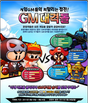 ... 각 게임의 운영자 3인은 타 게임의 운영자 3인으로 이뤄진 연합팀과 담당 게임으로 실력을 겨루게 되며, 유저들은 각 게임의 이벤트 페이지에서 투표를 통해 대전결과를 예측할 수 있다. 게임당 한 번씩 총 네 번에 걸쳐 투표가 가능하다. 이벤트 기간 동안 경기는 비공개로 진행되며