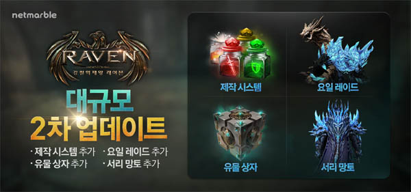 ... 박영재 넷마블 본부장은 “장비에 대한 자율도를 높인 장비 제작 시스템을 통해 원하는 장비를 직접 제작해 사용할 수 있어 이용자들에게 큰 만족감 줄 것으로 기대한다”며, “조만간 한층 짜릿한 ‘레이븐’의 전투액션을 즐길 수 있는 ‘실시간 레이드’도 선보일 예정이니 많은 관심 부탁