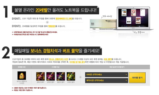 ... 회원가입을 한 유저 가운데 추첨을 통해 30명에게 영화예매권(1인 2매)이 지급되고, 20레벨까지 달성한 유저들에게 추첨을 통해 맥북에어(1대)를 증정한다. 기존 유저들을 위한 이벤트도 실시된다. 이벤트 기간 동안 매일 게임에 접속한 유저가운데 30레벨 이하의 유저에게는 보너