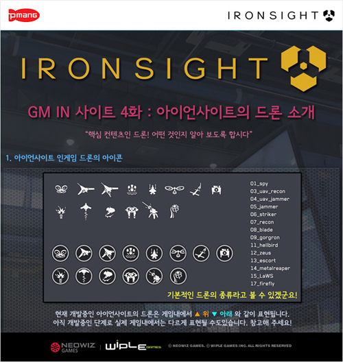 ...게이머들은 서로 다른 유형의 드론을 3종류까지 장착해 전투모드와 전략에 따라 적절하게 사용할 수 있다. 해당 페이지에는 이 외에도 드론의 아이콘 및 특장점등이 함께 자세히 설명돼 게임에 등장하는 드론의 이해를 돕는다. 이 밖에도 이용자들과 지속적인 소통을 위해 진행중인 토크 이벤