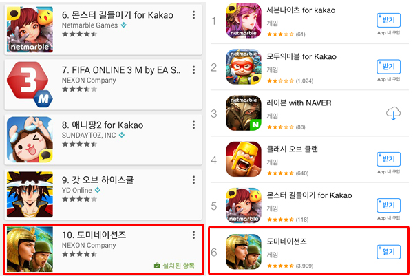 ... '도미네이션즈'는 현재 애플 및 구글플레이 추천 게임에 등록된 상태로 마케팅과 함께 시너지 효과를 보여 당분간 인기는 지속될 것으로 전망된다. 이 게임은 석기 시대부터 우주 시대에 이르는 세계의 주요 문명들을 유저가 이끌어가며 시대의 발전에 따라 진화하는 병과나 기술