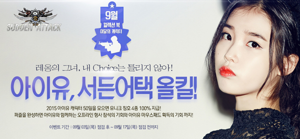 ...9월 17일까지 캐릭터 퍼즐 아이템을 모아 '2015 아이유 퍼즐판'을 완성하는 선착순 1000명에게는 '아이유와 함께하는 오프라인 행사' 참석 기회를, 추첨을 통해 500명에게는 '아이유 대형 마우스패드'를 제공하며, 퍼즐을 완성한 전원에게는 아이유의 목소리 효과가 담긴 '아이유