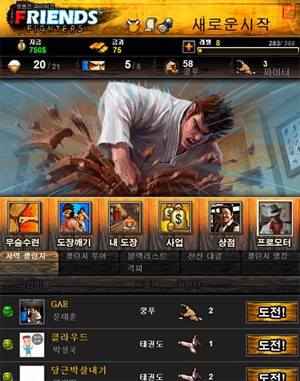 ... 네이버 소셜앱스용 'FF'에서 플레이어는 6종류의 무술 중 한 가지를 선택하여 도장을 개설하고 네이버 블로그, me2day의 친구들을 파이터로 영입, 최고의 도장으로 발전시켜야 한다. 다른 도장을 격파하는 도장깨기, 자신의 도장을 공격한 유저를 지목하여 친구들로 하여금 복수를
