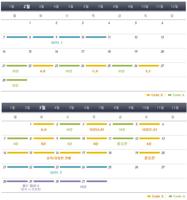 ... GSL 스폰서십 시즌2대회는 코드S와 코드A 대회가 각각 진행된다. 코드S는 최상위 그룹으로 32명이 4명씩 8개조로 편성돼 조별리그를 치뤄 16강을 가리고 16강에서 다시 조별리그를 통해 8강 진출자를 선별한다. 8강부터는 토너먼트로 진행되고 우승상금은 5천 만 원이다