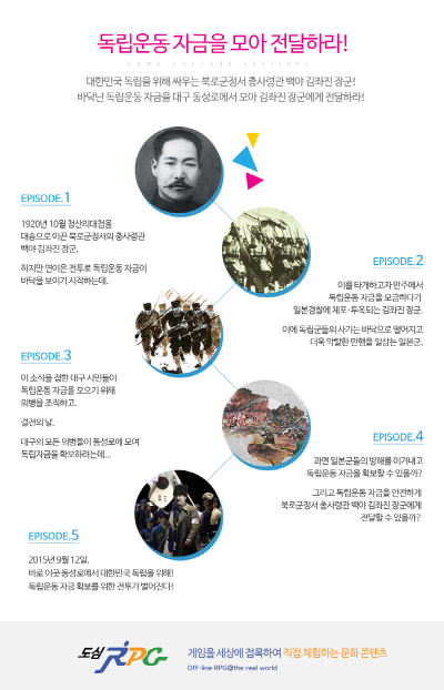 ...총 5개의 에피소드가 전개되는 '도심 RPG'는 바닥난 독립운동 자금을 대구 동성로에서 모아 백야 김좌진 장군에게 전달하기 위한 미션을 성공해야 한다. 참가자는 도심 RPG를 통해 역사 의식을 고취시킬 수 있으며, 게임의 배경이 된 대구시의 풍경과 주요 명소 등을 자연스럽게 감상할
