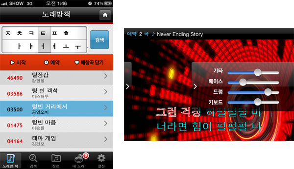... 또, 와이파이 외에 3G 환경에서도 빠른 곡 로딩이 구현돼 야외에서도 스마트폰을 스피커에 연결해 사용하는 것도 가능하다. 금영 노래방앱에서는 기존 노래반주기와 마찬가지로 가요, 팝, J-팝, 동요 등을 지원하며 실시간으로 최신곡이 업데이트 된다. 최신곡 외에도 실시간 인기곡,
