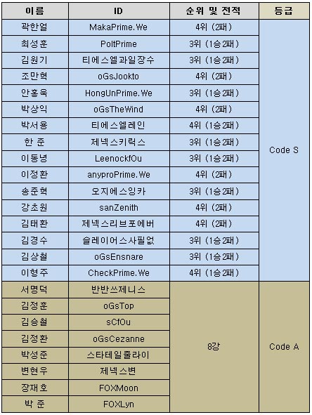 ... 승격강등전은 코드S 2명과 코드A 1명의 선수가 1개 조로 편성돼 이 중 최종 2ㅁ병이 다음 시즌 코드S를 획득하는 방식으로 치뤄지며 지난해 시즌1 우승자 김원기(Z)선수를 비롯해 시즌3 준우승자 박서용(T), '마카' 곽한얼(T) 등이 코드S를 지키기 위해 나서며 '투신' 박