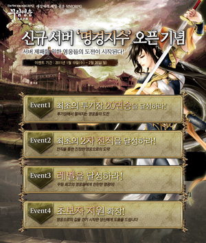 ...갈라랩(대표 박승현)은 자사가 서비스하는 웹MMORPG '무림영웅'의 네 번째 신서버 명경지수의 오픈을 맞아 내달 28일까지 이벤트를 진행한다. 신규 서버 명경지수 오픈 기념 이벤트는 최초의 투기장 20연승을 달성하라!, 최초의 2차 전직을 달성하라!, 레벨을 달성하라!, 초보자