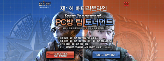... 참가 접수는 오는 2월 6일까지 이며, 온라인 예선을 거친 16개 팀을 선별해 2월 20일에 서울 강남 지역에서 오프라인 경기 대회를 진행할 예정이다. 대회 전투 방식은 폭파 미션모드로만 진행 되고, 맵은 매 경기마다 무작위 추첨으로 선택 된다. 출전 시 전투 장비 등은 게임