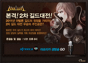 ... 19일과 20일 양일, 오후 7시, GM들과의 예선을 거쳐 선발된 총 16팀의 길드들이, 21일 오후 6시부터, 준결승 및 결승전 등 본선 경기를 진행하게 되며, 아발론 GM 저질 곰돌이의 진행으로 아프리카 TV를 통해 실시간 생중계된다. 대회는 홈페이지 내 위맨 게시판 내 댓