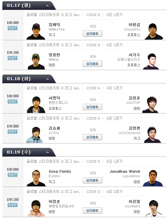 ... 지난해 개최된 GSL 시즌1-2-3 우승자 가운데에서는 시즌2 우승자 '명탐정' 임재덕(Z)선수 만이 유일하게 8강에 진출했다. 임재덕 선수는 17일 18시 'fOu'팀의 희망 이형섭(P)선수와 8강전이 진행되고 이어 '사기수' 선수와 'MVP' 정종현 선수는 19시 30분