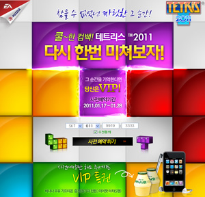 ... 테트리스 2011을 사전예약한 응모자 전원에게는 바나나맛 우유 기프티콘이 제공되며추첨을 통해 아이팟 터치 4세대(5명)도 제공될 예정이다. EA모바일 마케팅팀 박경아 과장은 "게임역사에 한 획을 그었다는 평가를 받는 테트리스를 EA 모바일에서 새롭게 선보일 수 있게 되어 기쁘다