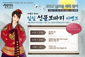 ...갈라랩(대표 박승현)은 자가사 서비스하는 MMORPG '무림영웅' 유저를 대상으로 12일부터 신묘년 새해 맞이 이벤트 2종을 진행한다. 먼저 내달 1일까지 3주간 진행되는 일일 선물 보따리 이벤트는 게임에 접속하는 모든 유저에게 갈비찜과 수상한 상점 무료 이용권 등 다양한 아이템들