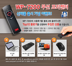 ...대원CTS(대표 정명천)는 일상 생활 곳곳에 쓰이는 제품을 만드는 3M의 무선 프리젠터 신제품 3M WP-7200을 선보이며, 이를 알리는 이벤트를 진행한다. 3M WP-7200은 한 손에 잡히는 사이즈의 무선 프리젠터로 UP/DOWN/F5/ECS/Blank 버튼과 한 개의 레이