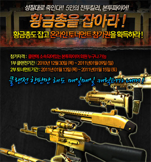... 더불어 이벤트 기간 내 클랜전 경기횟수가 1회 이상인 클랜을 무작위로 선정, 황금총기를 지급하는 행운도 기다리고 있다. 또한, 온라인 토너먼트 참가자격을 얻은 7개 클랜은 1월 13일부터 15일까지 3일간 토너먼트를 진행한다. 이중 우승한 클랜에게 문화상품권을 지급하고 우승 클