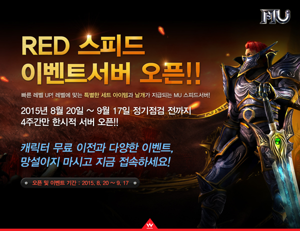 ... 해당 서버에서는 마검사/다크로드/레이지파이터/그로우랜서 등의 2차 캐릭터도 아무 조건 없이 처음부터 선택, 500레벨까지 육성할 수 있다. 또한 '스피드 이벤트서버'에서 육성한 캐릭터는 서버 운영 종료 이후에도 ‘뮤 레드’의 정식 서버로 무료로 이전 가능하다. 해당서버 내 캐릭