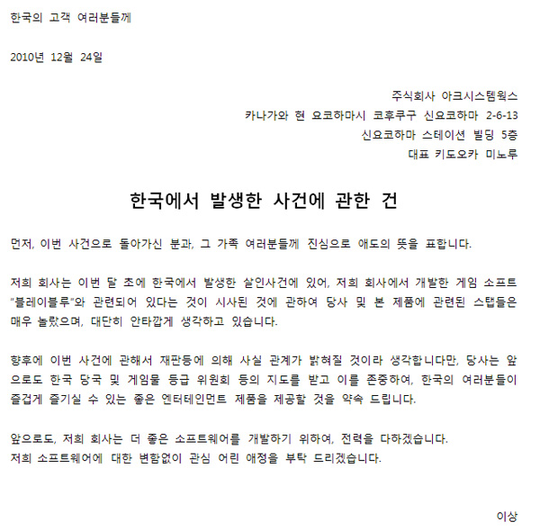 ... 다음은 아크시스템웍스가 이번 사건에 대해 밝힌 코멘트 전문이다. [게임조선 편집국 gamedesk@chosun. com] [game