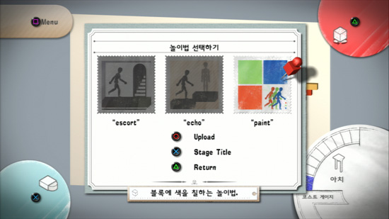 ... 또, 게임을 진행하면서 획득한 모형과 상자를 사용해 자신만의 스테이지를 만들어 이를 전세계 유저들과 공유할 수 있으며, 다른 유저가 만들어 놓은 스테이지를 검색해 즐길 수 도 있다. 특히, 어려운 스테이지에서 독특한 방식으로 퍼즐을 해결했을 때 이를 녹화해 리플레이 영상을 유