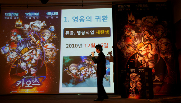 ... 업데이트 소개를 맡은 오한별 ‘메이플스토리’ 개발실장은 “지난 빅뱅 업데이트로 41만 동접자 달성을 기록하며 온라인게임업계에 족적을 남겼다”며 “책임감과 자신감 가지고 다음 업데이트를 준비했다”며 업데이트 소개를 이어나갔다. 우선 16일로 예정된 영웅의 귀환 업데이트에서는 듀얼